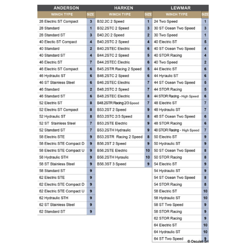 | Winch Size Height x Base | Standard 130 x 140mm, Standard 145 x 140mm, Self-Tailing 160 x 145mm, Self-Tailing 180 x 150mm, Self-Tailing 200 x 170mm, Self-Tailing 215 x 190mm, Self-Tailing 230 x 200mm, Self-Tailing 250 x 205mm |